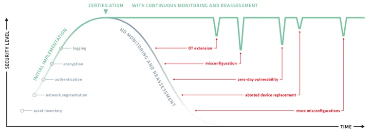 Fig. 1: After the initial implementation of the standard, both the OT and the threat landscape continue to evolve, creating an outdated level of security over time that must be continuously reviewed and brought up to date.